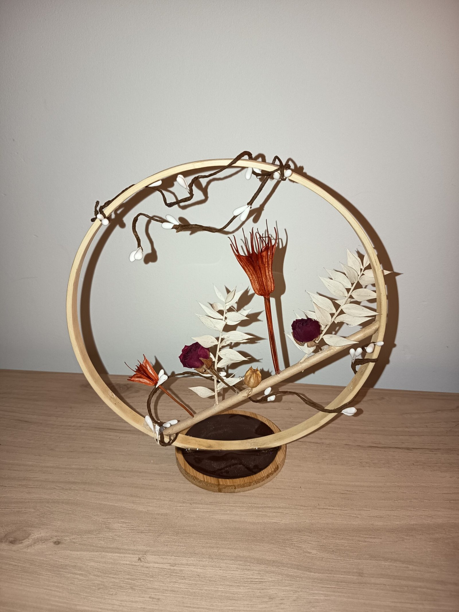 Cercle fleuri diam.200cm sur socle bois.